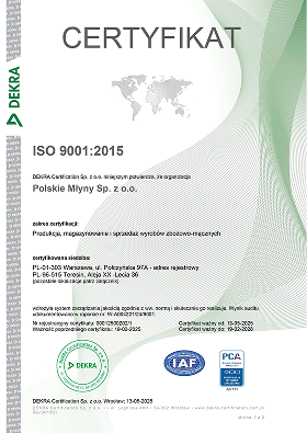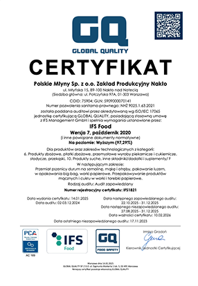 W Polskich Młynach priorytetem jest najwyższa jakość i bezpieczeństwo naszych produktów. Nieustannie dążymy do doskonalenia procesów produkcyjnych, co potwierdzają liczne certyfikaty i wdrożone standardy. Dzięki temu masz pewność, że wybierając Polskie Młyny, wybierasz to, co najlepsze.